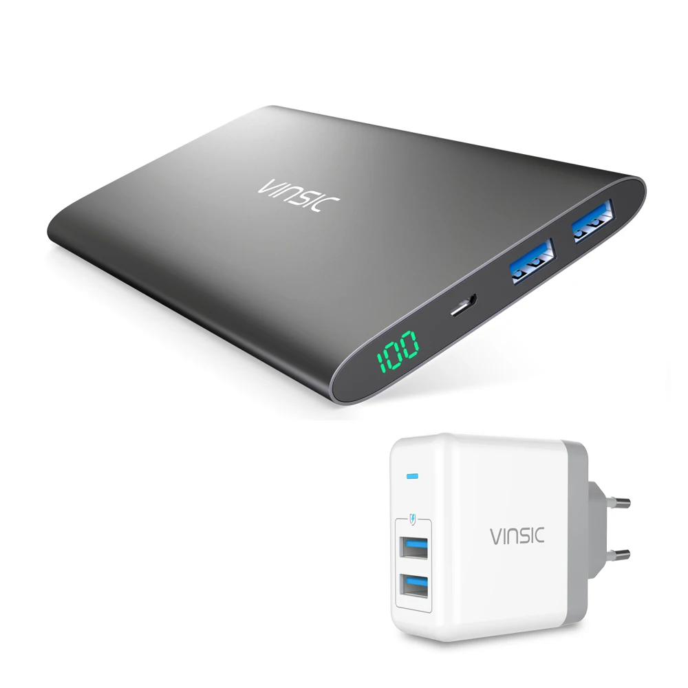 Vinsic Charging Brand among the world. It isn’t simply bigger capacity — it’s better in every way. Simpler, dramaticallythinner. More powerful, but remarkably power efficient. Smooth aluminum surface, with exclusive one piece design, creating anew generation of power bank that’s better by any measure. 3D cambered surface ground by CNC processing made our power bank looks super slim, the surface made with beautiful anodizedaluminum with the highest aluminum sands which you will find our power bank looks more exquisite and glitter than for Apple product, definitely eye-catching! Exclusive One Piece Design appealing to even Steve Jobs. No ON/OFF button, Charging will automatically start when connected.Touching the screen the remaining battery life will get showed immediately. Smoothly side meets the anodized aluminum enclosure ina remarkable, simplified design. No distinct edges, No gaps, just a smooth, seamless bond of metal that feels like one continuous surface. Using international high-end cell supplier, Lithium-Polymer battery (the same for iPad’s) Vinsic power bank 12000mah comes with two USB ports 2.4A &2.4A which can be used to charge two devices simultaneously.It is universal fits for iPhone, iPad, iPod, for Samsung devices, HTC phones, tablet PCs, digital cameras, game consoles and MP3/MP4 players, etc