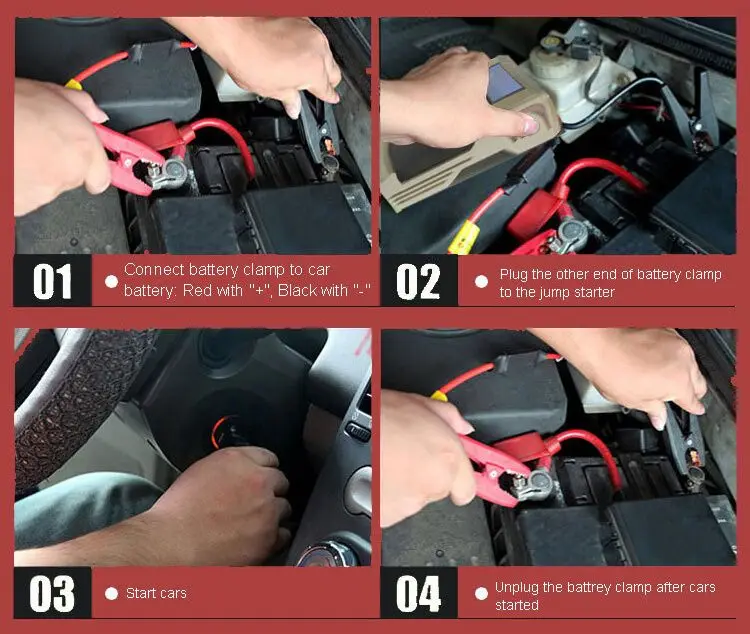 Attention please: 1. For your safety, please DO NOT disassemble the jump starter. Once dismantled by yourself, we will not service for any arising issue. 2. Please make sure that the jump starter is Fully Charged before startingthe engine. 3. If the jump starter can not start at one time. Please try it again after 30 seconds or longer, and start more slowly.