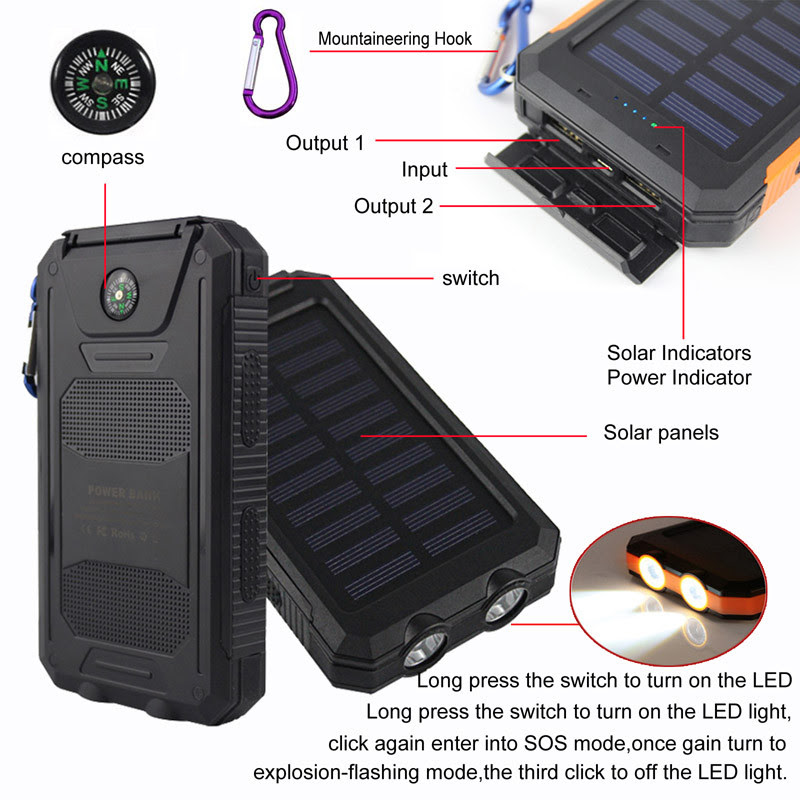 NEW Waterproof Solar Power Bank 10000mah Dual USB Li-Polymer Solar Battery Charger Travel Powerbank for all phone Features: