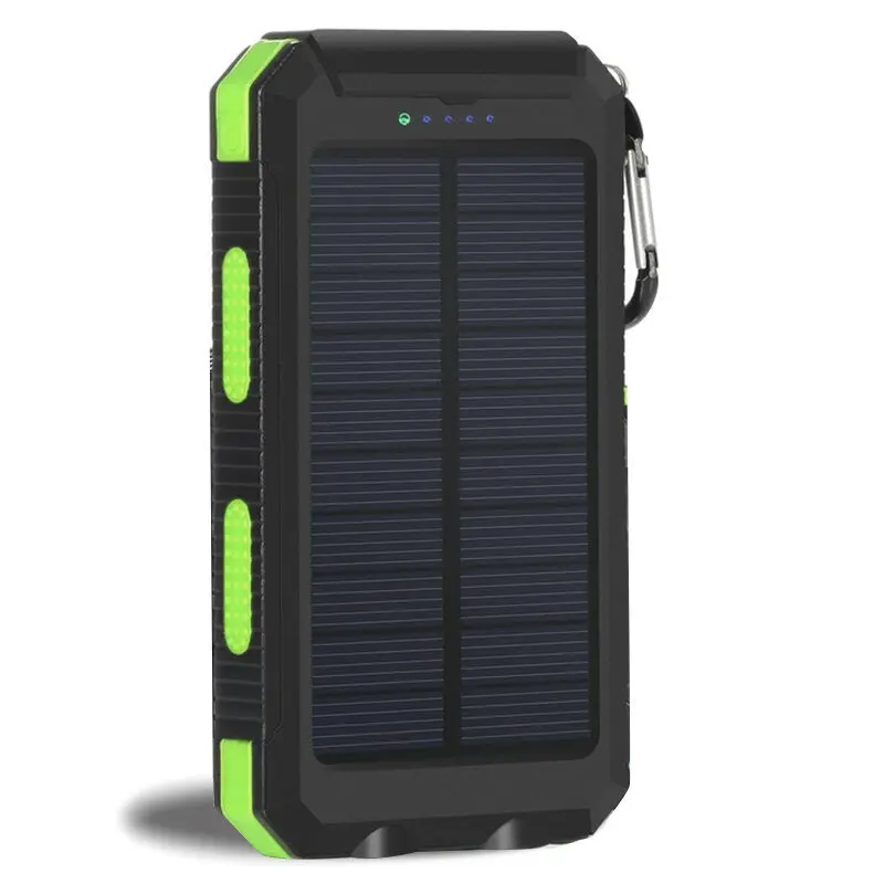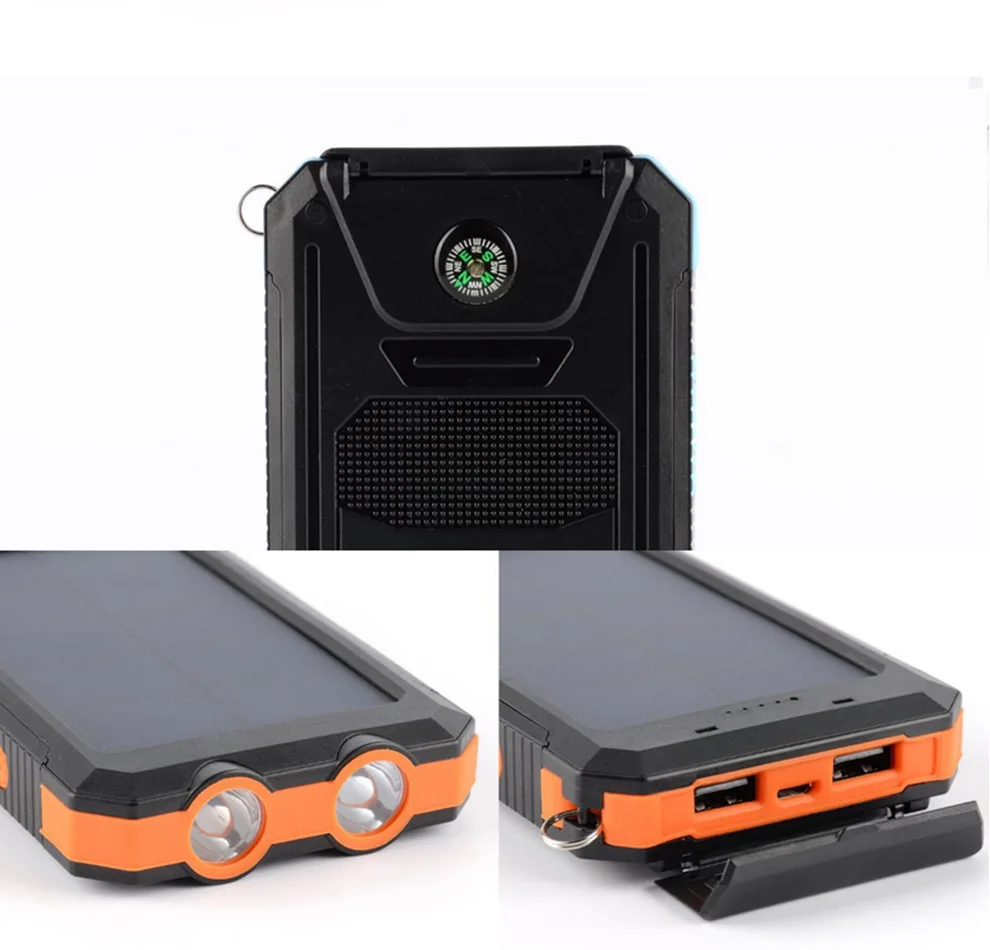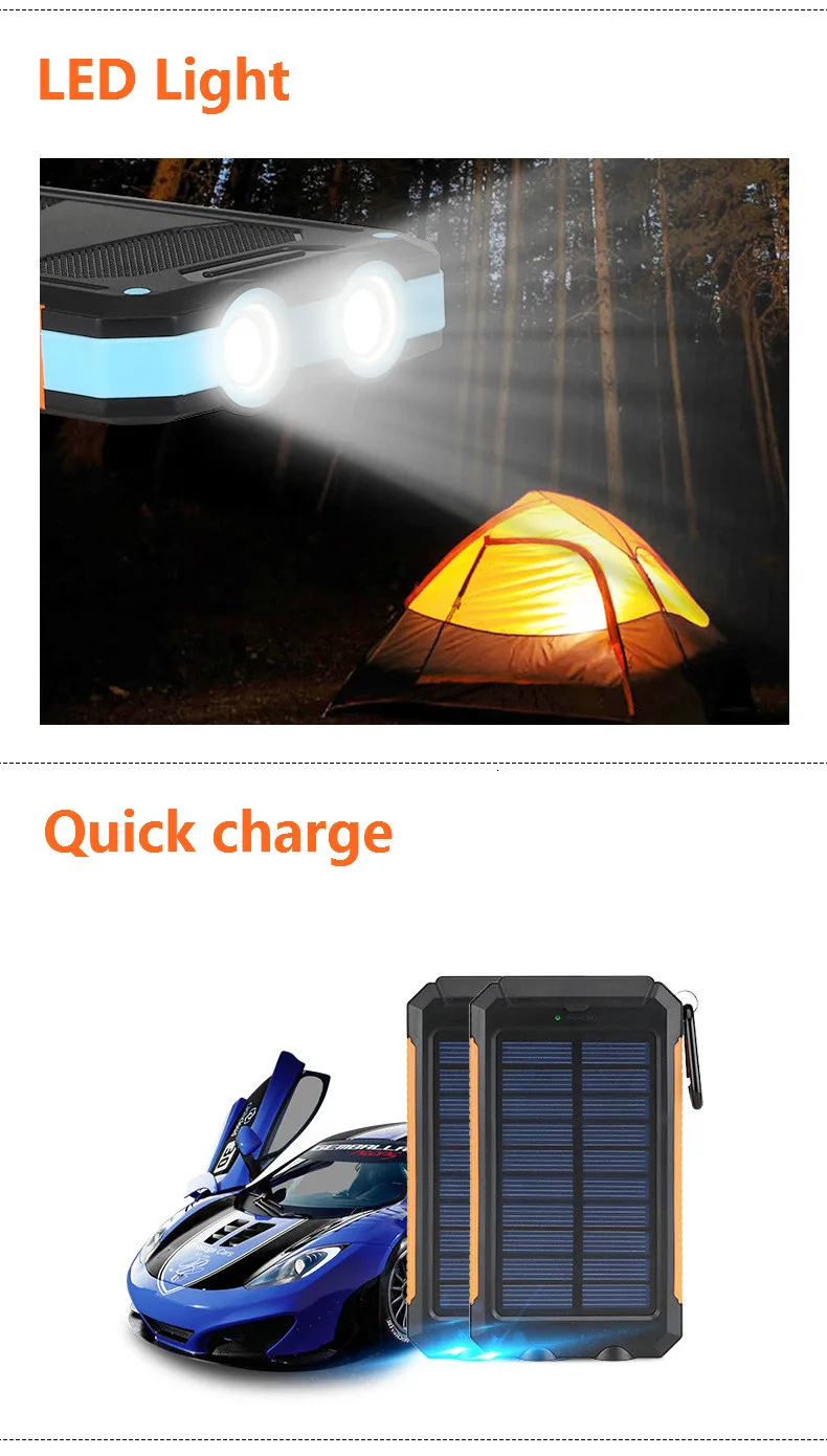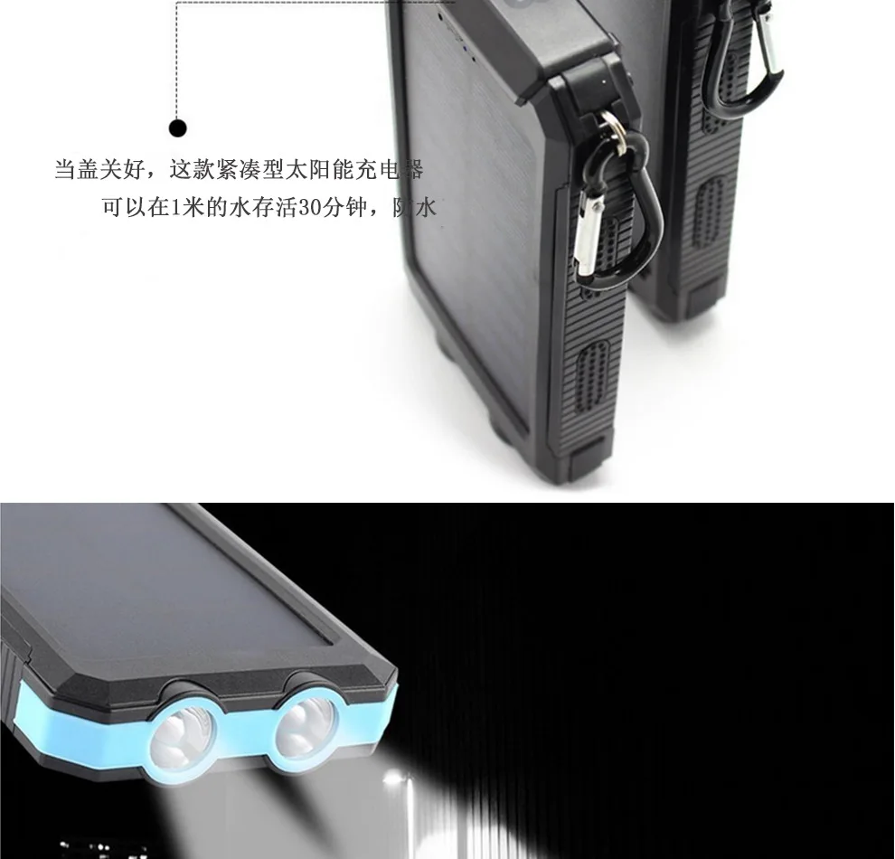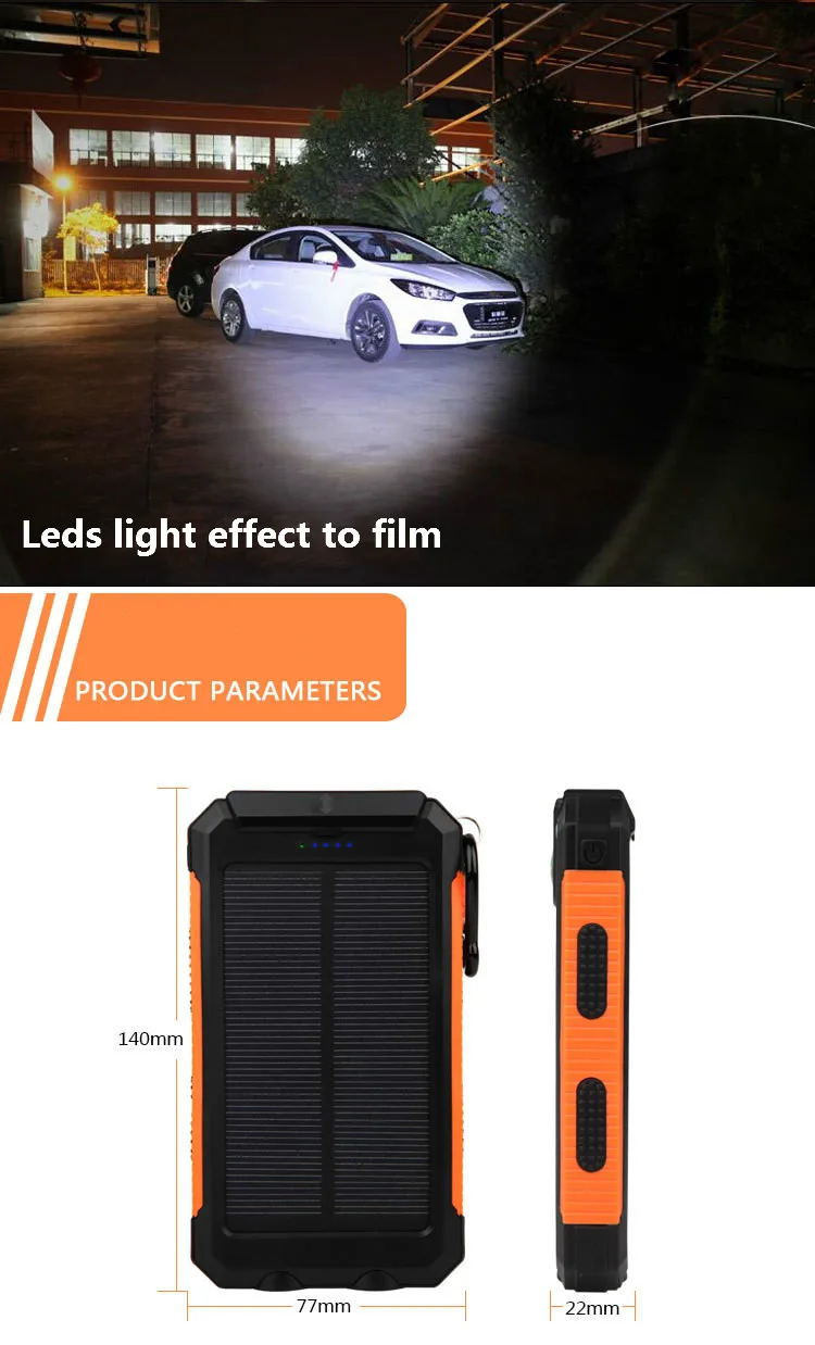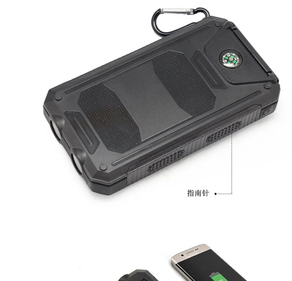 NiceSolar Replacement Batteries for Dual USB Phones Replacement Batteries for Phones 20000 mAh Waterproof Power Bank Bateria External Portable Solar Panels with LED Backlight Note: the solar charging function, because the solar conversion speed, only decorative features, there is no actual function of charging, charging and charging the power source. We hope that buyers can understand this moment, the real solar energy, the more, more expensive. Specifications* Battery Type: Lithium Polymer Battery* Capacity: 20000 mAh (10000 mAh + 10000 mAh solar charging)* Solar charger: Max.5V 200 mAh* Input: DC 5 V / 1A* Output: DC 5 V / 1A; 5V2. 1AAttention: Solar charger (5V 200mAh, 10000mAh Capacity) is designed for emergency use, it does not charge main resources, it takes about 40H for full charging under direct sunlight, Therefore it is recommended to charge the charger which takes about few hours.Product DescriptionTwo portscharge two devices at the same time on the go, 2.1A charging provides fast charging speed to you.High qualityThe best eco-friendly silicone protects it from rain, dirt and bumps / drops. It uses a lithium polymer battery with 10,000 mAh.Equipped with more protection system charge. more than 1000 + recharge the life cycle.Wide compatibilityCompatible with most USB-powered devices, such as for Iphone, for Ipad, for iPod, For Samsung phones, other Android mobile phones, GoPro cameras, GPS and moretake into accountThe solar charger is mainly for use in emergencies, not the main charging resources. It takes about 40 hours to be fully charged under direct sunlight, so it is highly recommended to charge the charger, which takes about several hours.Note: Since the solar panels are too small, the energy absorption is very low, therefore take a long time to make the charger, But you can use a charging cable for mobile devices charging connector1 to three charge to use the wall charge, until the full power, Better activation of the built-in battery capacity.2 for a long time without using the product, please pay for three months.3, when light on, disconnect the charger connector, avoiding the time to charge and damage the battery.4 as far as possible to keep the dry product from the high temperature environment.packagingEquipment:1 x Solar power bank1 x USB cable1 X hanger with compass1 package