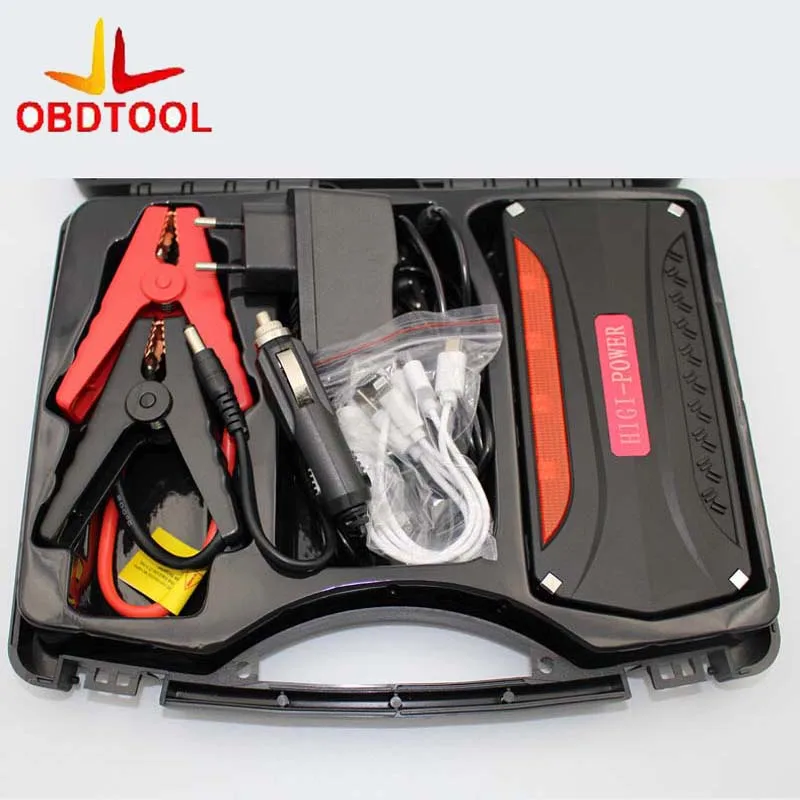 Anti-slip design, clutch it with no worry even in the hot summer.Plastic case package: easy carry, easy storage. High capacity with high power polymer battery is adopted for fast charging.It can support an emergency jump start and entirely replace the included battery for a car startup. It also supports general cellular phones/laptops charging and completely replaces products similar to mobile power banks. With true powerful flashlight , three-function switch-over, emergency rescue, signaling , lighting, deterrence, defense and other powerful features -it is the ideal choice for night shift workers, overtime workers and many others. Four levels of power display indicate battery status, real-time recharging reminders, automatic shutdown under no-load condition. Over-current protects the device from overload, making it more convenient, safer and more energy-efficient. Features:Charging for mobile phones and laptops, starting cars, adjustable LED lights (torch, strobe lights or SOS lights).Multi-functional emergency kit that contains a car power bank.Variety of chargers and jump lead that can give your car and your products the extra energy they need.With a plastic case that also contains the adapter tips and power lead, this product will fit in your car to be used in case of emergency. It uses high-power battery that supports fast charging, low self-discharge, up to 1,000 charging cycles.It supports vehicles with 12V voltage or more. to start your car, firstly you should connect the power bank with the battery holder and then connect the negative and positive connectors of the holder with your car battery. There are a variety of adapters that be used to charge various mobile phones, Sony PSP, MP3/MP4 players, PDAs, notebooks, car refrigerators and other compatible appliances.It has 3 different kinds of lighting modes - you can use the flashlight and SOS lights in the dark in case of emergency. Specifications:Battery capacity: 68,800 mAhLED illumination light with 4 alarm lights, voltage output indicator and battery indicator.Electrical quantity indicator light.Key switch,Master switch . Emergency safety hammerEmergency seat belt cutting knife 12V / 16V / 19V voltage output indicator lights12V / 16V / 19V --- 2A / 3A / 3.5A output4 USB output:5V / 1-2.1ACharge input:12V - 1AStarting current:200-300APeak Current:600ABattery life:3000 circlesOperating temperature:0-85Battery Size:165 x 79 x 40 mmBattery Weight:470g Instructions for use:1. Select the appropriate voltage and connector for the electronic device to charge / power supply2. Press the switch to start charging when your device connected with the power bank. If you unplug thecable, auto-sleep will start in one minute.3. Four LED lights will flash circularly during the charging and all lights will keep bright when your device is full-charged.4. During charging for your device, LED lights indicate the balance power of the built-in battery. Four lights indicate 80% balance, three lights indicate 60% balance, two lights indicate 40% balance and one light indicates 20% balance.The built-in battery is empty when all LED lights start to flash.5. Press the switch five seconds to start If you want to use LED for illumination and select the status (light, strobe, SOS, close) by pressing the switch to transform.6. Store the product in a cool and dry place and away direct sunlight.7. we have US,EU,AU,UK plugs for choices,normally we send according to your country,but it is better you leave us message by which plugs you need in case of inapplicability.this will not be an excuse for refund.thank you for your understanding. Cautions:To avoid from accidents, make sure note the following cautions:1. Take off the main unit within 30 seconds after starting the car.2. Dont clip the two terminals at the same end on the battery.3. Dont Disassemble the unit. Package:1x 68,800 mAh jump starter battery1x Charging plug1x Car charger adapter1 x Four-in-one mobile phone Charge cable1x Storage battery wire clip8x Laptop adapter1 x Carrying case1 x Users Manua