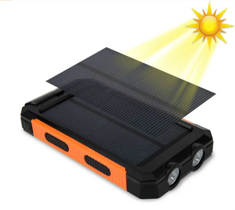 Note: solar charging function, because the solar conversion speed, only decorative characteristics, there is no actual function of charging, charging and charging the power source. We hope that buyers can understand the moment, the real solar energy, the more expensive.specifications* Battery type: Lithium polymer battery* Capacity: 20000mAh (10000mAh + 10000mAh from solar charge)* solar charger: Max.5V 200mAh* input: DC 5 V / 1A* output: DC 5 V / 1A; 5V2. 1AAttention: solar charger (5V 200mAh, 10.000mAh capacity) is in case of emergency it does not charge main resources, it takes about 40H for full charge under direct sunlight, therefore it is recommended to charge the charger about few hours ,Product descriptiontwo portsTwo devices go on the same time, 2.1A charging provides fast charging speed to you.high qualityThe best eco-friendly silicone protects it from rain, dirt and bumps / drips. It uses a lithium polymer battery with 10,000 mAh.equipped with more protection system responsible. More than 1000+ charge the life.wide compatibilityCompatible with most USB powered devices such as Iphone, iPad, iPod, Samsung phones, other Android phones, GoPro cameras, GPS and moreaccountThe solar charger is mainly for emergency use, not the main charging resources. It takes about 40 hours to be fully charged under direct sunlight, so it is strongly recommended that the charger takes over several hours.Note: Since the solar panels are too small, the power consumption is very low, therefore a long time to make the charger, but you can charge a charger for mobile device charging port1 to three charge to use the wall charge, until the full power, better activation of the built-in battery capacity.2 for a long time without the product, please pay for three months.3, when light up, disconnect the charger plug, avoiding the time to charge and damage the battery.4 As far as possible to keep the dry product from the high temperature environment.packagingequipment:1 x solar energy bank1 x USB cable1 X hanger with compass1 packageReturn Policy